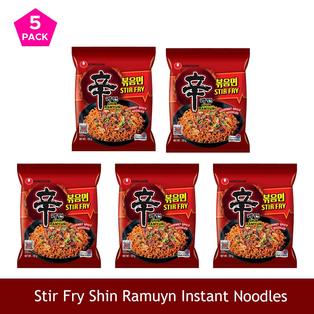 - Nongshim’s Shin Ramyun Stir Fry gourmet spicy instant noodles, This pack contains 5 (Five) single serve pack each of 131 g.